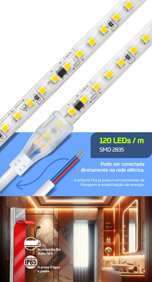 A Fita LED Direct é revestida com uma capa de silicone que proporciona proteção IP65. Isso significa que ela é totalmente à prova d’água e resistente à poeira e outros contaminantes, tornando-a ideal para uma ampla gama de aplicações, seja em ambientes internos ou externos.