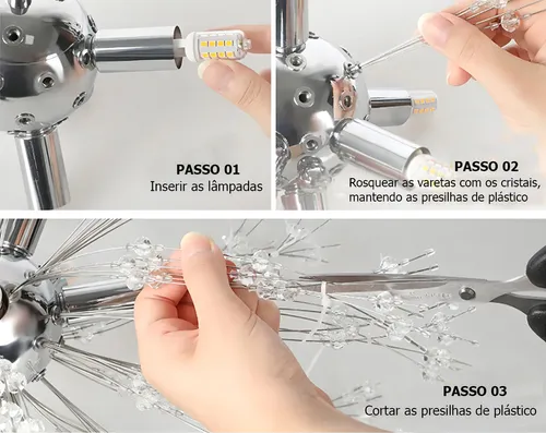Conta com o acabamento prata e cristais que trazem elegância e sofisticação ao ambiente. Ideal para sala de estar e jantar, quarto, hall de entrada, recepções, salão de festas, etc.
